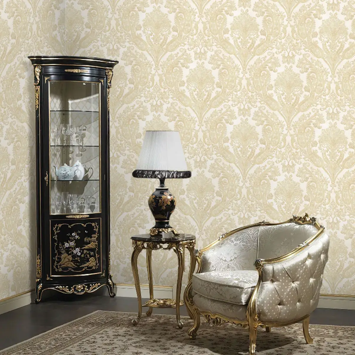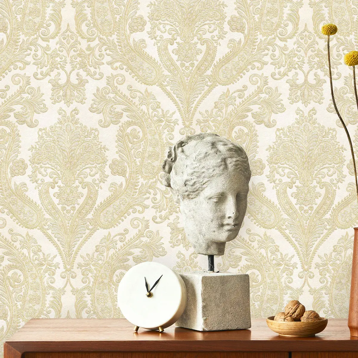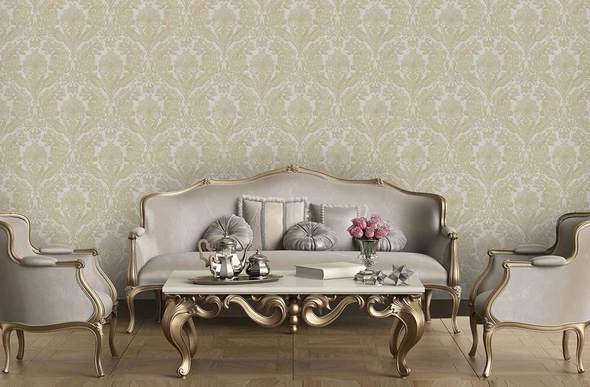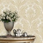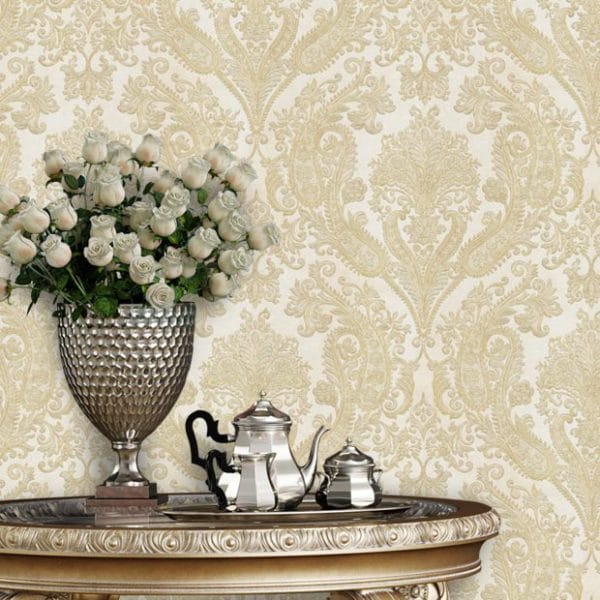 این کاغذ دیواری با طرح داماسک، مناسب برای فضای پذیرایی است و می‌تواند فضایی گرم و صمیمی با حس لوکس و تجملاتی ایجاد کند.